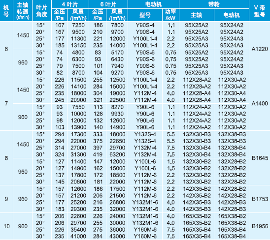 該型風(fēng)機(jī)按其葉輪直徑共分:No.6.7.8.9.10等5個機(jī)號。葉片數(shù)有4片,6片倆種。葉片安裝角度可制成15度、20度、25度、30度等4種。